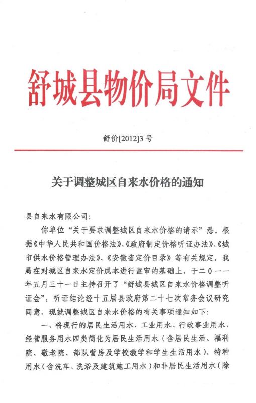 關(guān)于調(diào)整城區(qū)自來水價(jià)格的通知