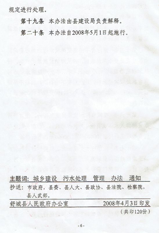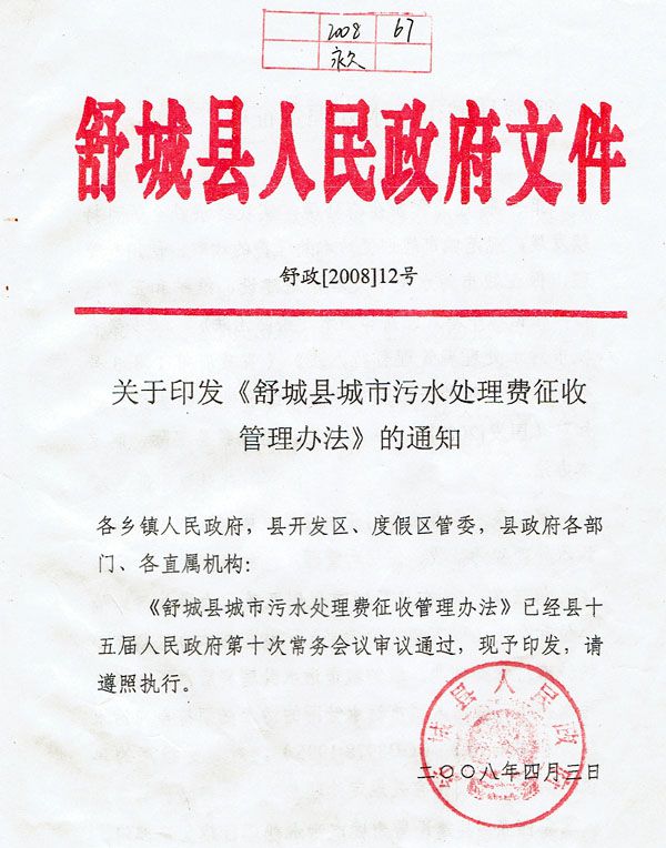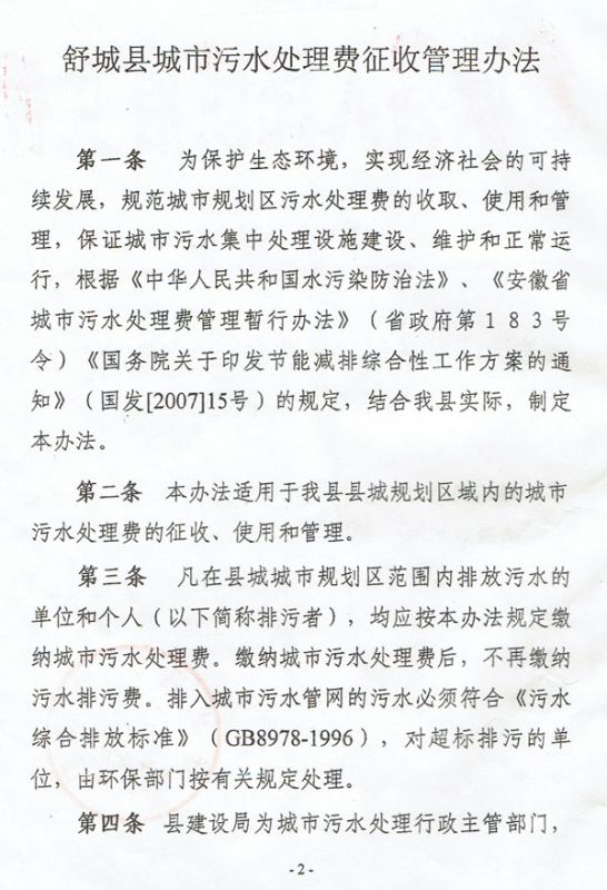 關(guān)于印發(fā)《舒城縣城市污水處理費(fèi)征收管理辦法》的通知
